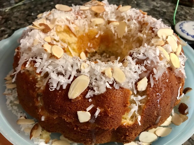 Allow to cool on a wire rack for 30 minutes. Carefully transfer the cake. Whisk the confectioners’ sugar and cream together, adding a few drops of water, if necessary, to make the glaze thick but runny. Drizzle the glaze over the cake with a small spoon. Top with the remaining coconut and slivered almonds. Serve at room temperature.