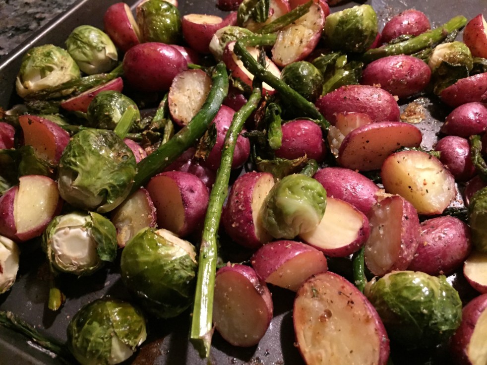 5. Arrange on a cookie sheet with asparagus and Brussel sprouts. Drizzle with a little more olive oil. Salt and pepper to your taste